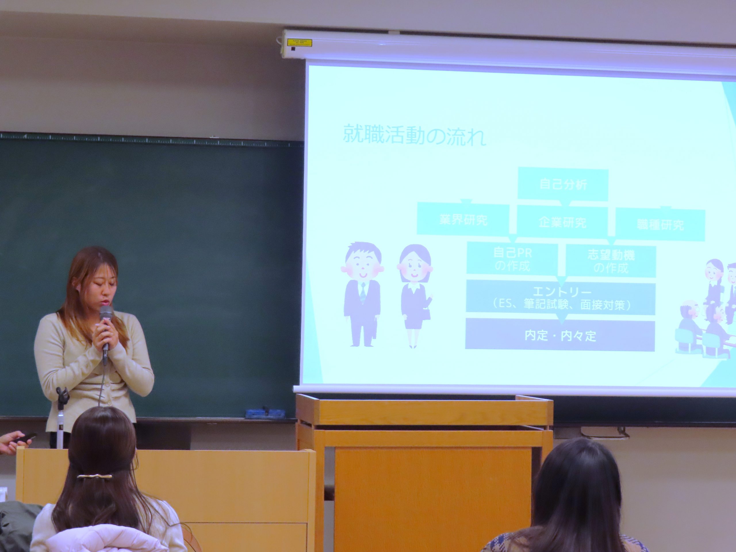2025年12月11日に、本学英語文化学科4年生の内定者4名をお招きし、第3回目の就職セミナーを開催しました。講演者は、大木ゆららさん、冨山真央さん、宮崎柚葉さん、中未那美さんで、それぞれ製造小売会社、マーケティング会社、航空会社などに内定が決まった学生です。