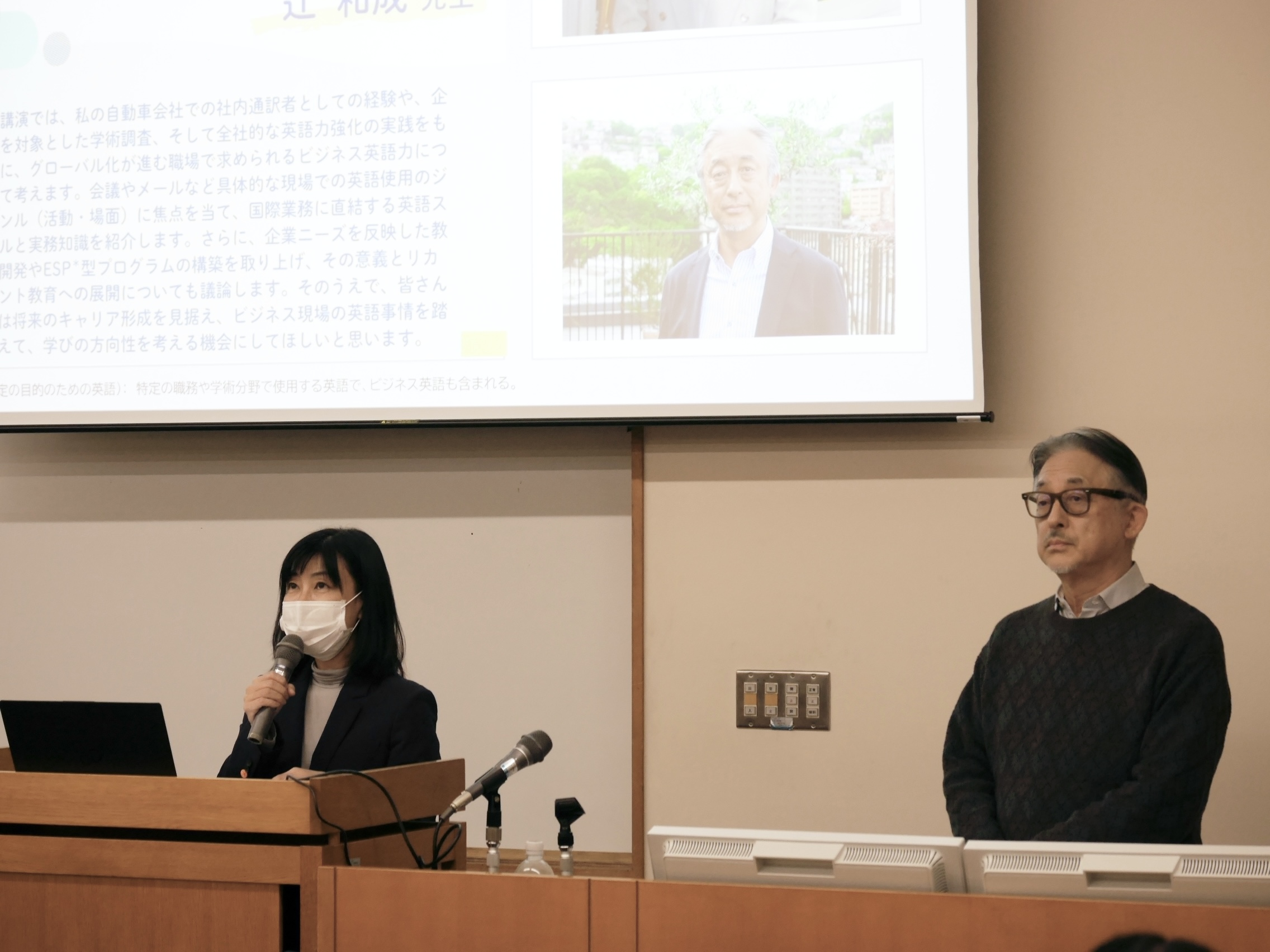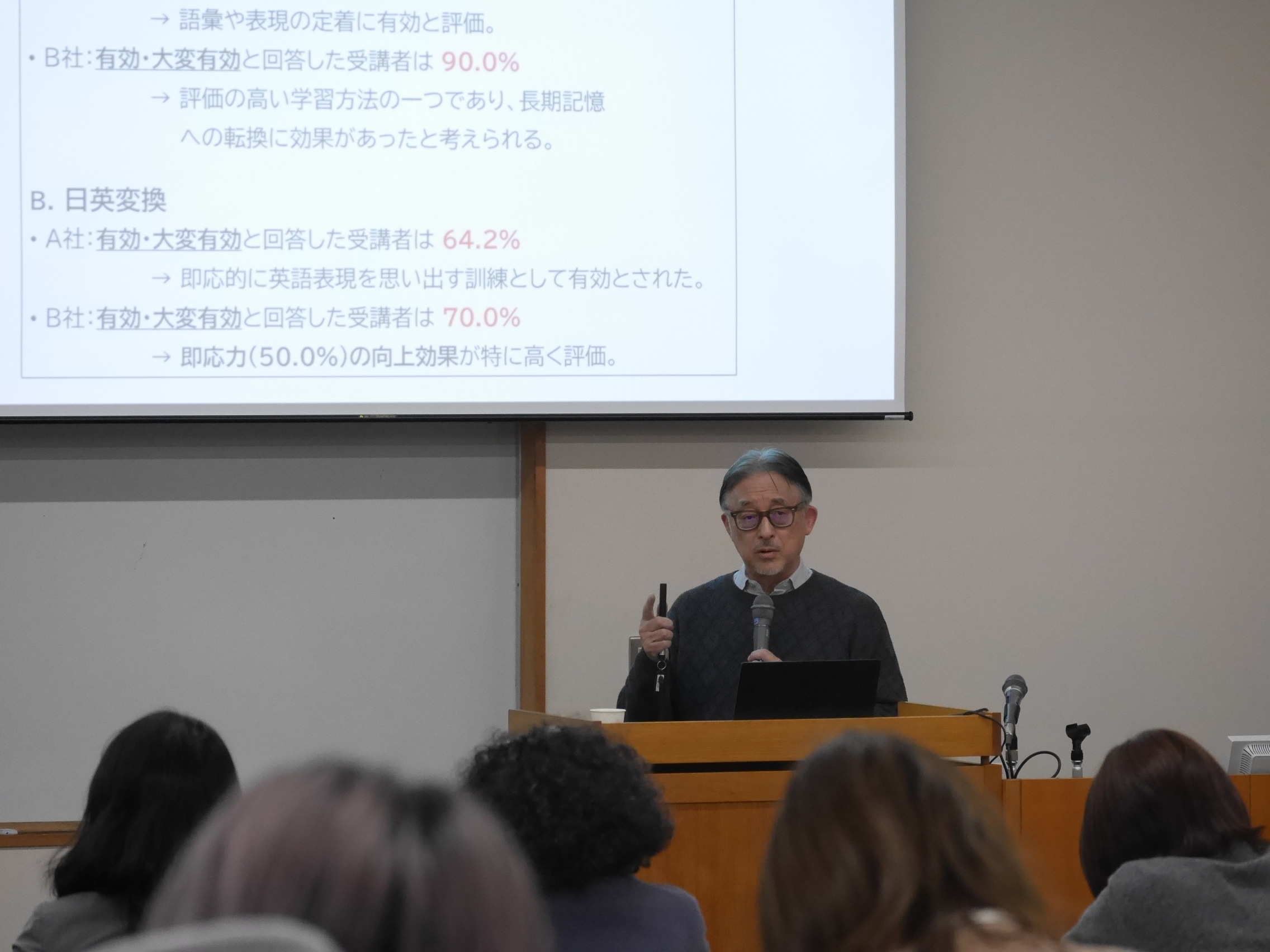 講演では、自動車会社で社内通訳者としてご活躍されたご経験や、企業を対象とした学術調査、全社的な英語力強化の取り組みなど、多岐にわたる実例をもとに、国際ビジネスの現場で求められる英語力についてお話しいただきました。