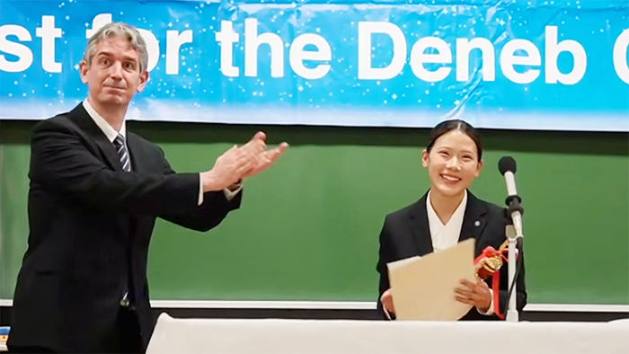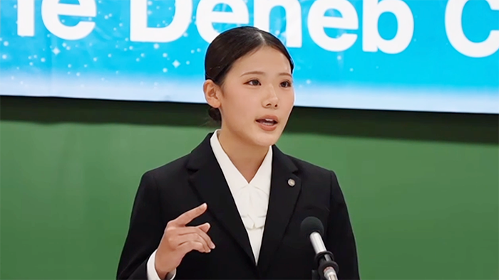 「デネブ杯」での上位入賞は、2022年の優勝、2024年の準優勝に続き3回目。今回の受賞をうけ、英語グローバル学科の清水研究室は、学外開催の英語弁論大会やプレゼンコンテストで10年度連続の上位入賞を達成しました。英語スピーチ・プレゼンの分野で、全国に誇る受賞実績を積み重ねています。
