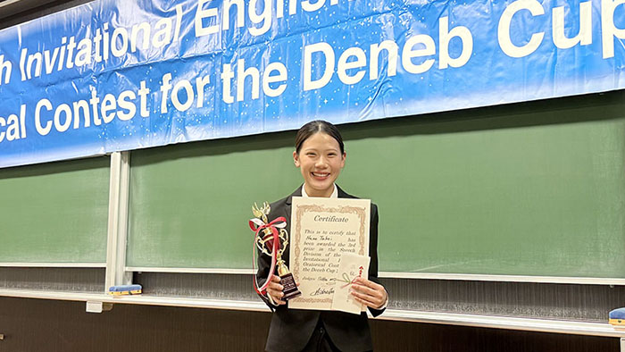 - 本学科の武井寧々さんが、「デネブ杯」英語弁論大会で3位入賞。本学科は10年連続の学外大会上位入賞を達成!