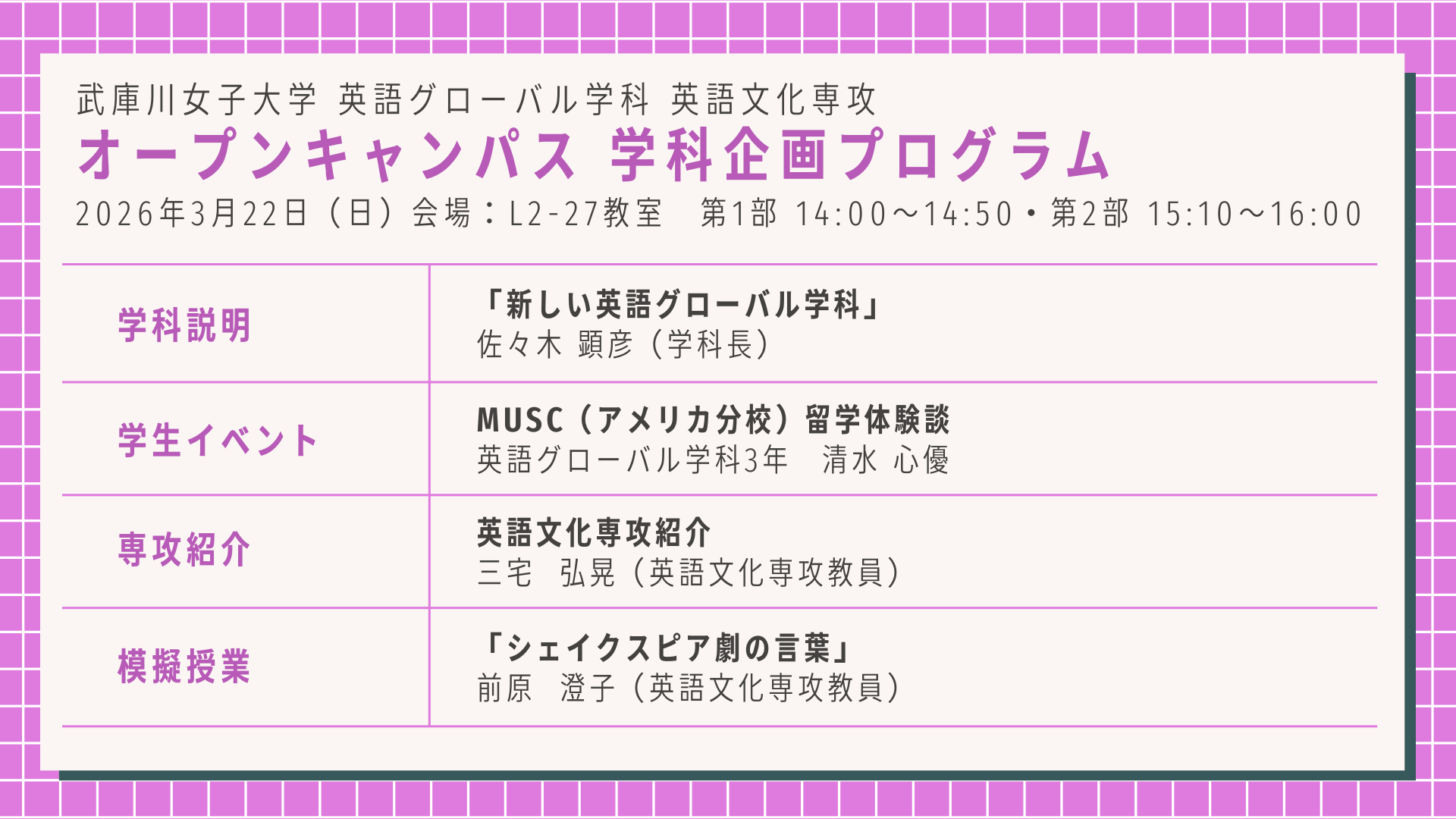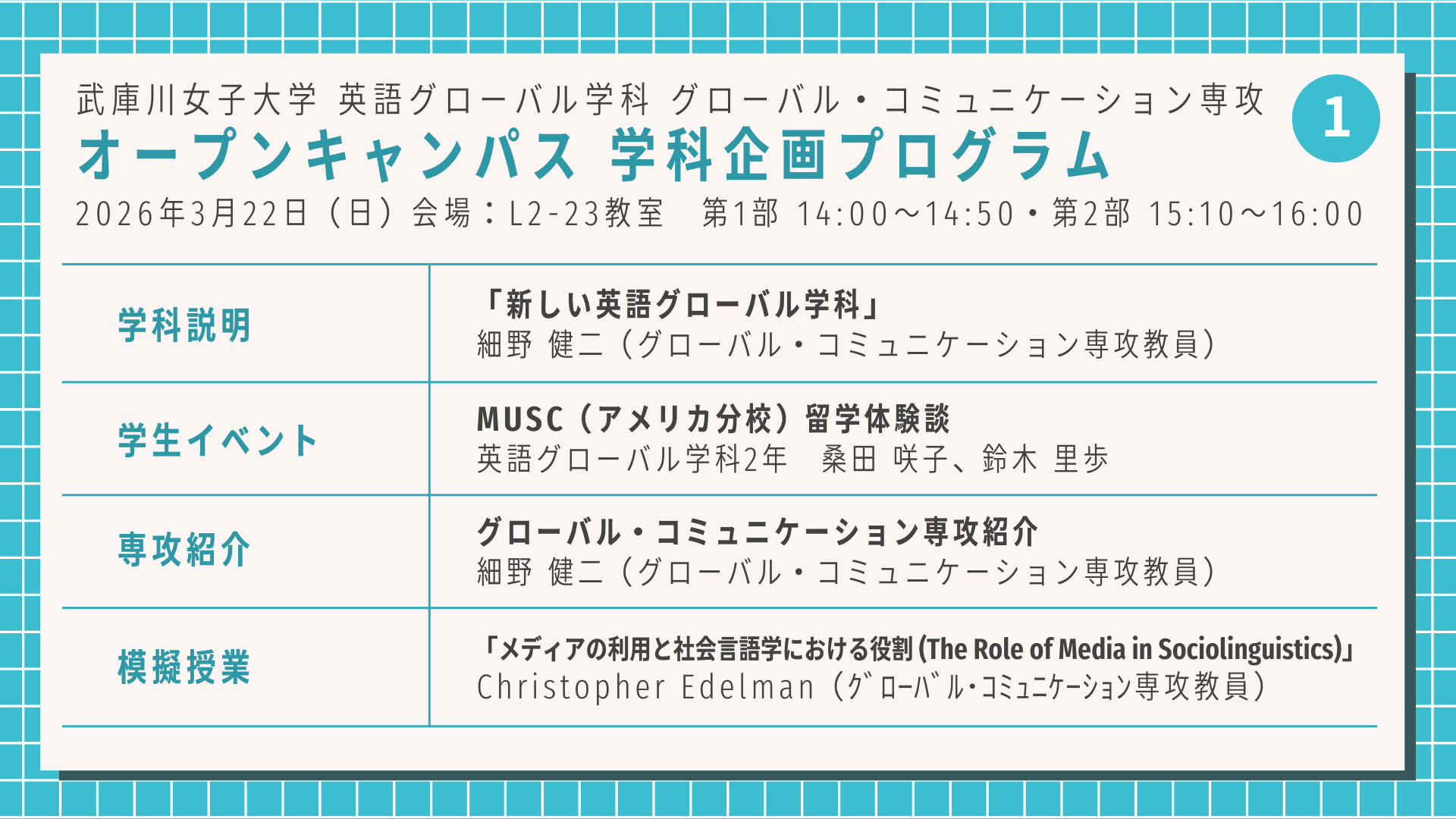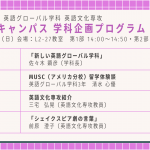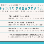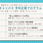 英語グローバル学科の学科企画プログラムでは、英語文化専攻、グローバル・コミュニケーション専攻に分かれて、学科説明のほか2専攻の説明や模擬授業を行います。詳しい内容については上記画像のプログラムをご確認ください。また、個別相談ブースも設置いたしますので、ご興味のある方はぜひお越しください。